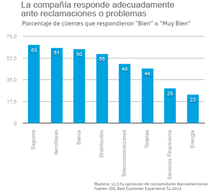 Por debajo del 50% de satisfacciónse situaron Telecomunicaciones (58%), Tarjetas (44%), Servicios Financieros (28%) y el último lugar fue para Energía (23%).