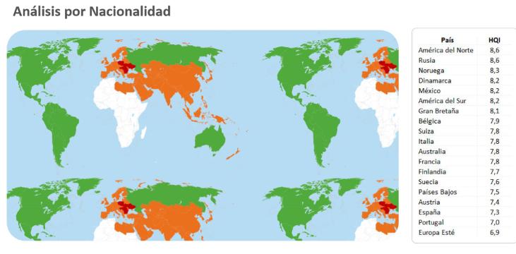 Los clientes americanos y los rusos son aquellos que mejor evalúan la calidad de los hoteles españoles con unos índices que alcanzan el nivel competitivo. Por un lado los primeros evalúan mejor la limpieza, mientras que los rusos la atención al público. Por otro lado los estados del Este Europeo (Polonia, Rumania, Ucrania, Eslovenia, Bulgaria, Hungría) no alcanzan la suficiencia y se muestran críticos con las instalaciones y la relación calidad-precio de los hoteles españoles.