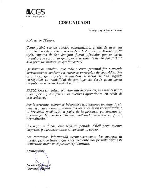 Desde CGS Chile han emitido un comunicado que os hemos copiado debajo, en el que lamentan lo ocurrido y señalan que tras este incidente se abre un período difícil para su empresa en el que agradecen la compresión y apoyo de sus clientes.