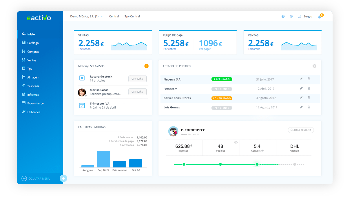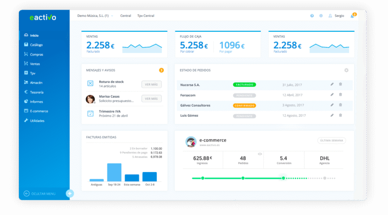 Gracias a eactivo podrás implantarlo sin apenas esfuerzo en tu negocio. Se trata de un avanzado programa en modadlidad cloud de facturación, TPV, gestión empresarial, contabilidad y ERP, que destaca por ser una herramienta muy intuitiva y que cubre las necesidades administrativas y comerciales de clientes en una amplia variedad de sectores.